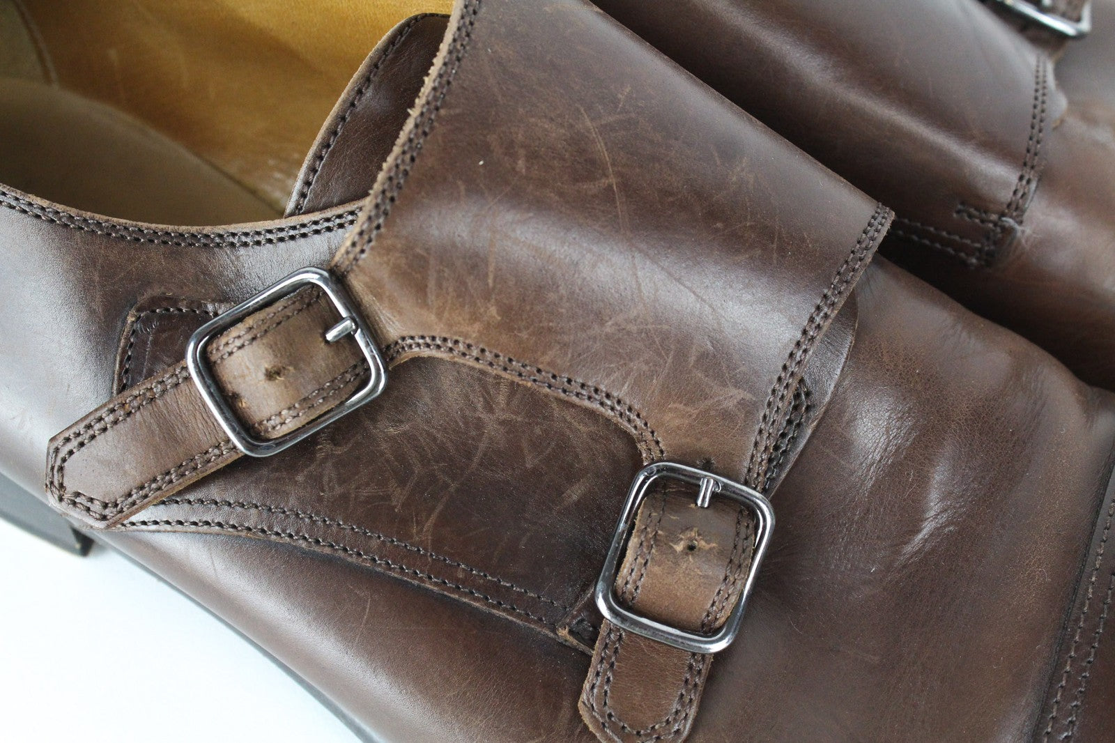 Used. Worn out outsoles. Wrinkly toe cap area. Scratched uppers, pressure marks. Tear around the right shoe's heel area. Missing buckle on the left shoe. Please see added photos.