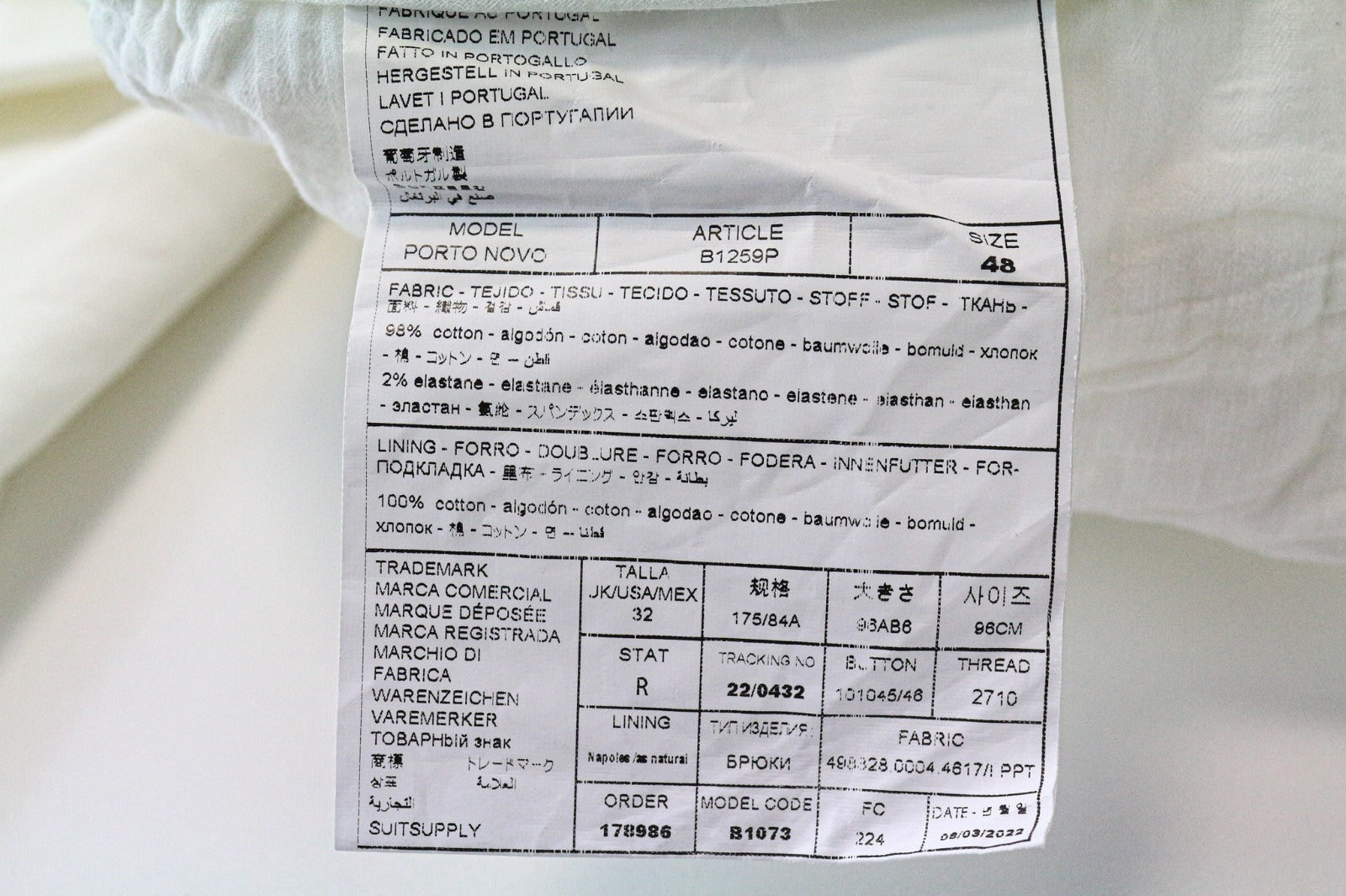 SUITSUPPLY Porto Novo Men's Pants UK32R White Slim Chino Stretch Flat Front