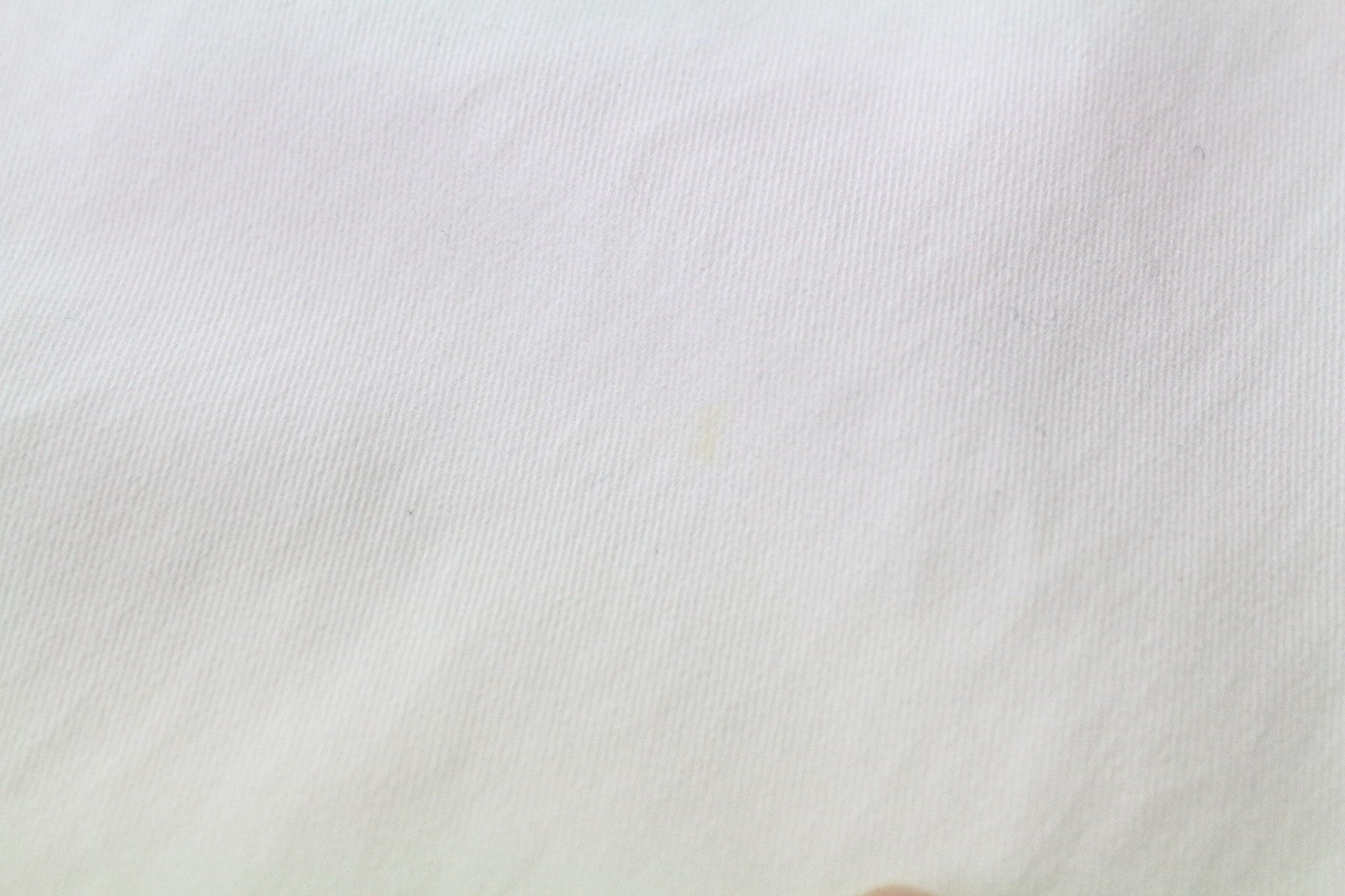 Stained back. Pulled thread on the left leg. Please see added photos.