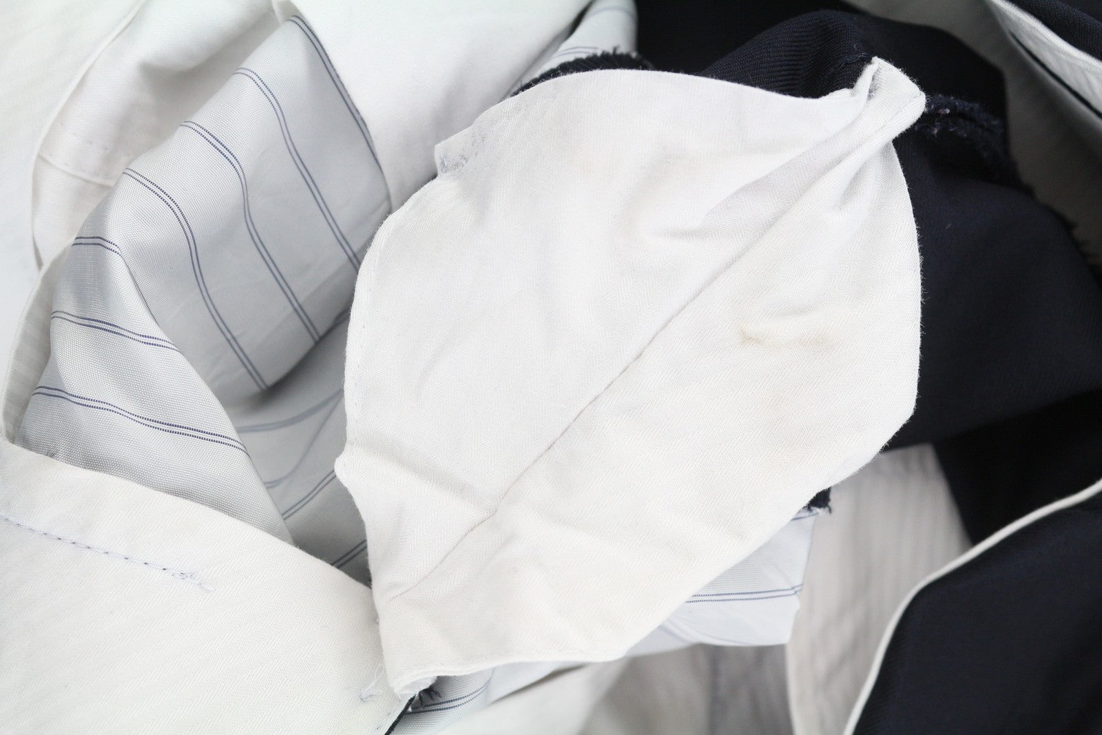 Condition: Some stains in a few places. The material slightly rubbed on the waist. Please see added photos.